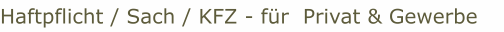| Im privaten Bereich sollte der Versicherungsschutz überschaubar sein. Unter "Online rechnen/Angebote" finden Sie Beispiele für Haftpflicht-, Gebäude-, Hausrat-, Glas- Unfall sowie Rechtschutzversicherungen als Orientierung mit der Möglichkeit des sofortigen Abschlusses. Gewerbliche Risiken unterliegen immer den besonderen Bedingungen des Wirkungsfeldes des tätigen Unternehmens. Die Ermittlung eines sich ergebenden größten Risikos des Unternehmens ist Grundlage für die Einschätzung des realistischen Haftpflichtrisikos. Deshalb ist eine persönliche Beratung zur Risikoaufnahme unabdingbar, um eine Risikoabsicherung zu erreichen. Das Ergebnis orientiert sich auf die Absicherung der Werte und Firmenziele. KFZ-Versicherungen sind in der Regel jährlich bis zum 30.11. kündbar. Bei Beitragserhöhung gilt bis 1 Monat nach Erhalt der Erhöhungsinformation, zum Beginn der Erhöhung ein Sonderkündigungsrecht. Bei Erstversicherung oder KFZ-Wechsel haben Sie die freie Wahl des Versicherers. Vergleichen Sie hier. Auf der Seite Online rechnen haben Sie die Möglichkeit Ihr persönliches Angebot für das KFZ und den weiteren persönlichen Bedarf zu ermitteln. Nutzen Sie den unabhängigen Vergleich. | ||||||||||||||||||||||||||||||